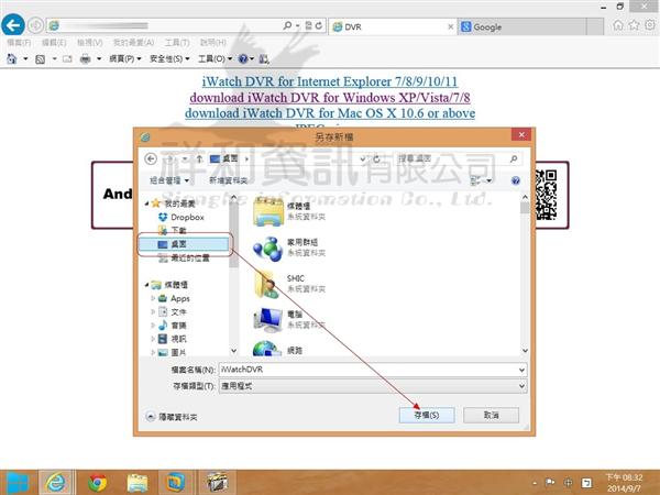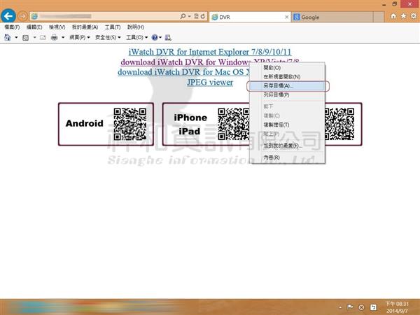 ◎找到第二項次之後滑鼠按右鍵→另存目標並選擇桌面將iwatchdvr存在桌面上。(見下圖1、2)